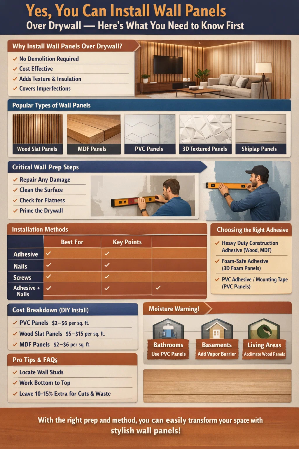 مع ذلك، "نعم يمكنك" لا تعني "أي لوحة، أي طريقة، أي سطح." هناك عوامل حاسمة تحدد ما إذا كان التثبيت الخاص بك سيبدو احترافيًا ويستمر لسنوات، أو سيتشكل فقاعات أو سيلتوي أو سيبتعد عن الحائط في غضون أشهر. يستعرض هذا الدليل كل شيء — بدءًا من تجهيزات الحوائط وحتى أنواع الألواح ووصولاً إلى خيارات المواد اللاصقة — حتى تتمكن من البدء بخطة واضحة.