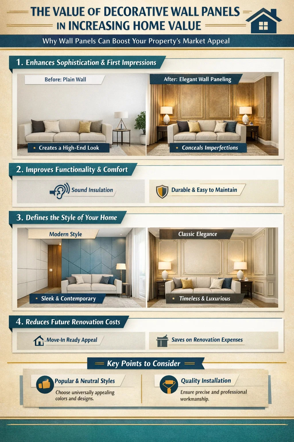 يفكر العديد من أصحاب المنازل فيما إذا كان تركيب لوحة الحائط المزخرفة مجرد تكلفة أم استثمار يمكن أن يزيد من قيمة العقار. بشكل عام، يمكن لألواح الجدران المصممة جيدًا أن تعزز بالفعل جاذبية العقار في السوق.