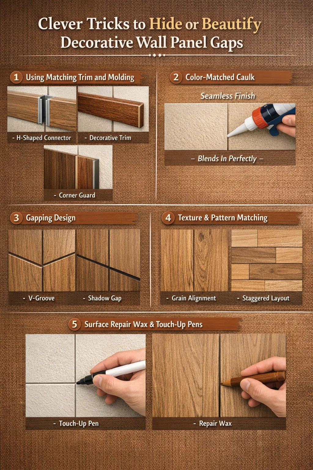 الزخرفة الزخرفية: إن الضغط على شريط زخرفي خشبي أو معدني جميل فوق الفجوة لا يغطي الفجوة فحسب، بل يضيف أيضًا تأثيرًا يشبه الإطار إلى ألواح الحائط المزخرفة، مما يمنحها مزيدًا من العمق.