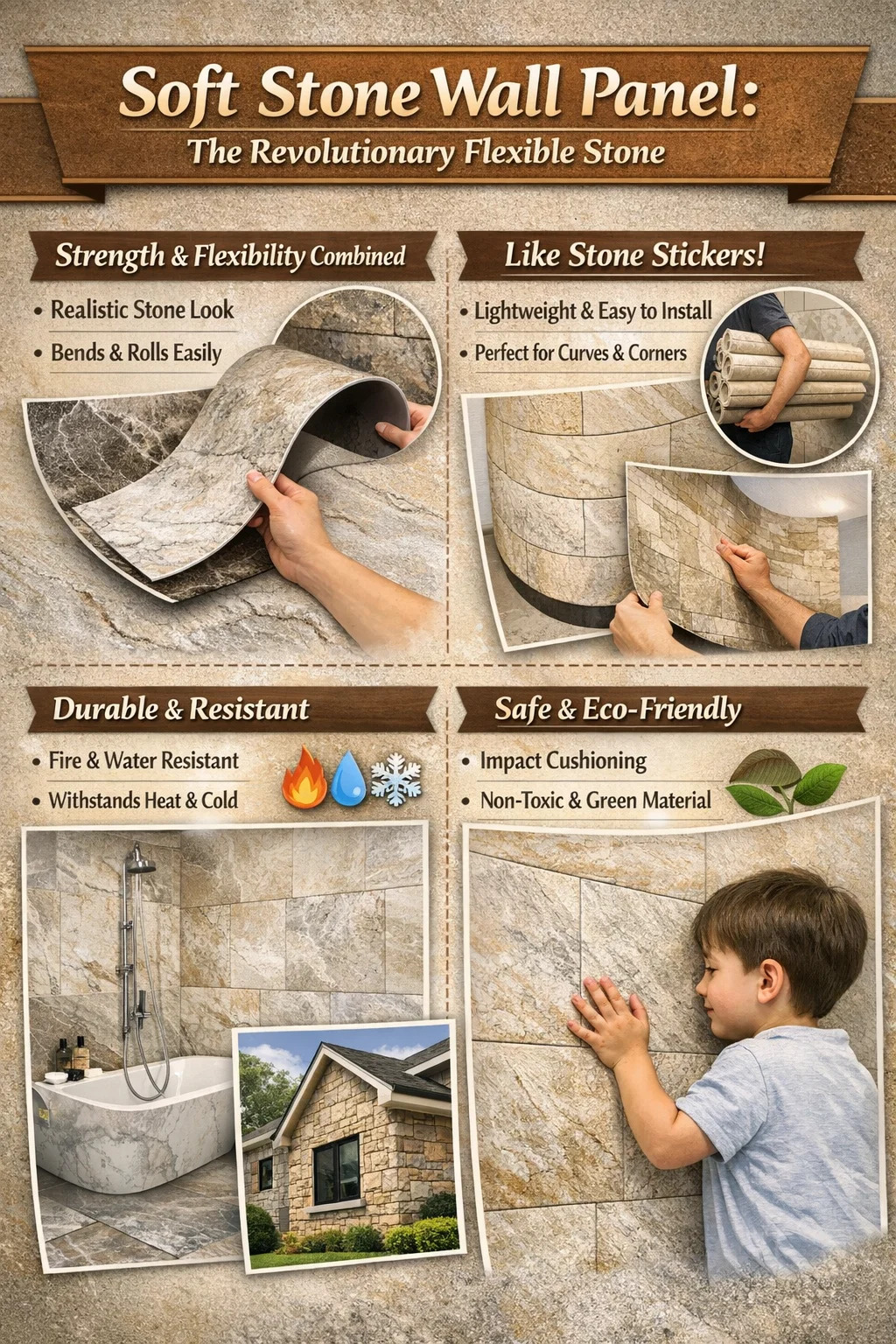 لوحة الحائط الحجرية الناعمة هو نوع جديد من مواد الحوائط التي تشبه الحجر ولكنها تتمتع بالمرونة ويمكن حتى ثنيها. إنه يكسر الصورة التقليدية للحجر على أنه "ثقيل وصلب"، وهو "تقنية متطورة" شائعة جدًا في صناعة التصميم الداخلي الحالية.