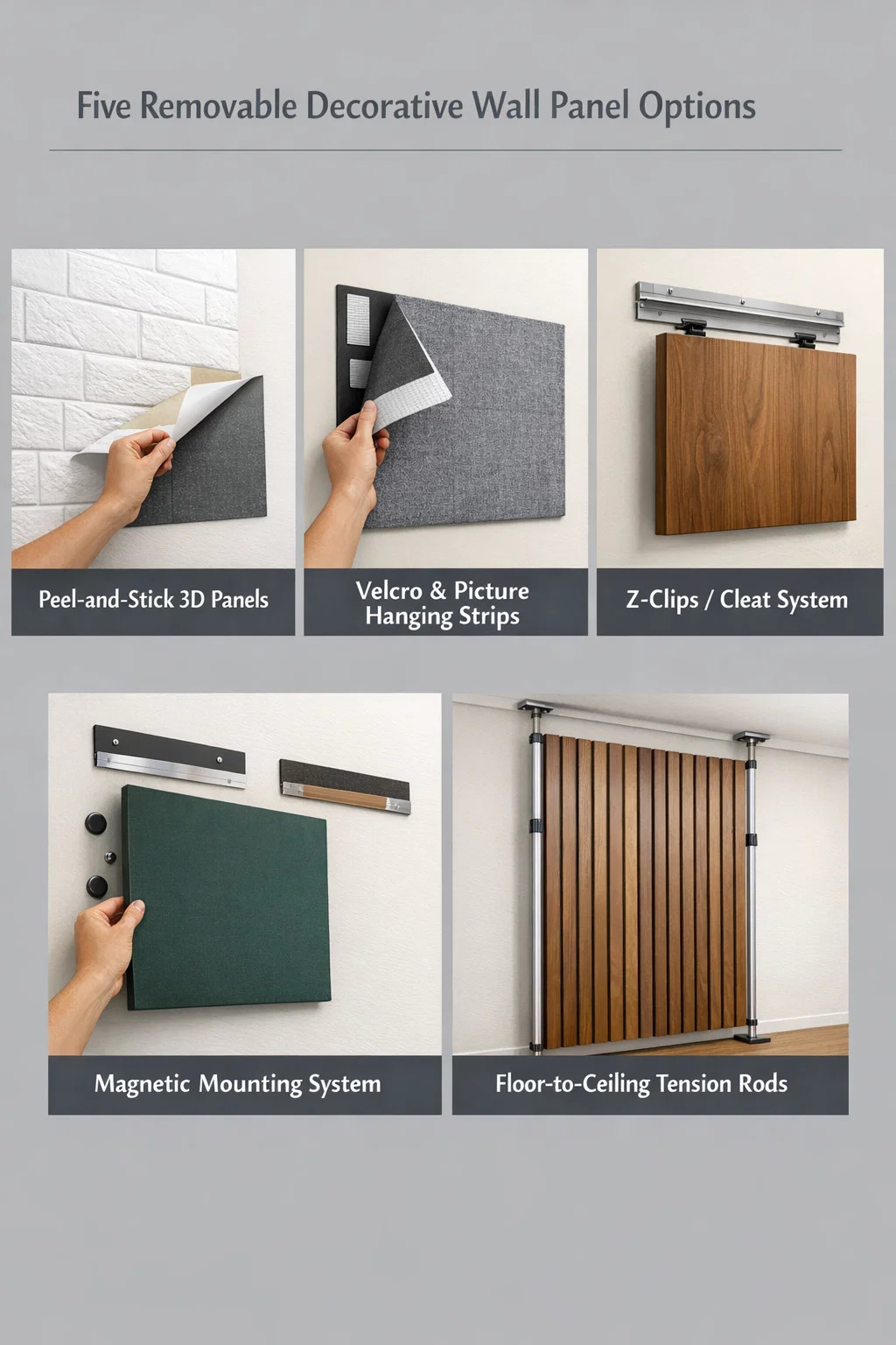 هذا حل أكثر تقدمًا وعالي التقنية. التثبيت اللاصق: قم بتركيب شرائط مغناطيسية صغيرة أو ألواح مغناطيسية على قاعدة الحائط، وسيكون الجزء الخلفي من ألواح الحائط المزخرفة به مغناطيس.
