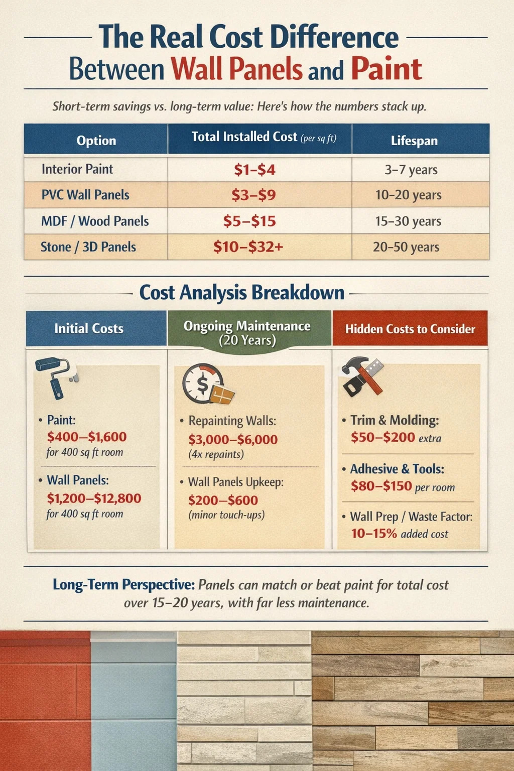 تعتبر الفجوة السعرية بين الطلاء وألواح الجدران المزخرفة كبيرة عند نقطة الشراء، ولكنها تضيق بشكل كبير عندما تأخذ في الاعتبار طول العمر والصيانة والعمالة المتضمنة بمرور الوقت. فيما يلي مقارنة واضحة لتكاليف خط الأساس:
